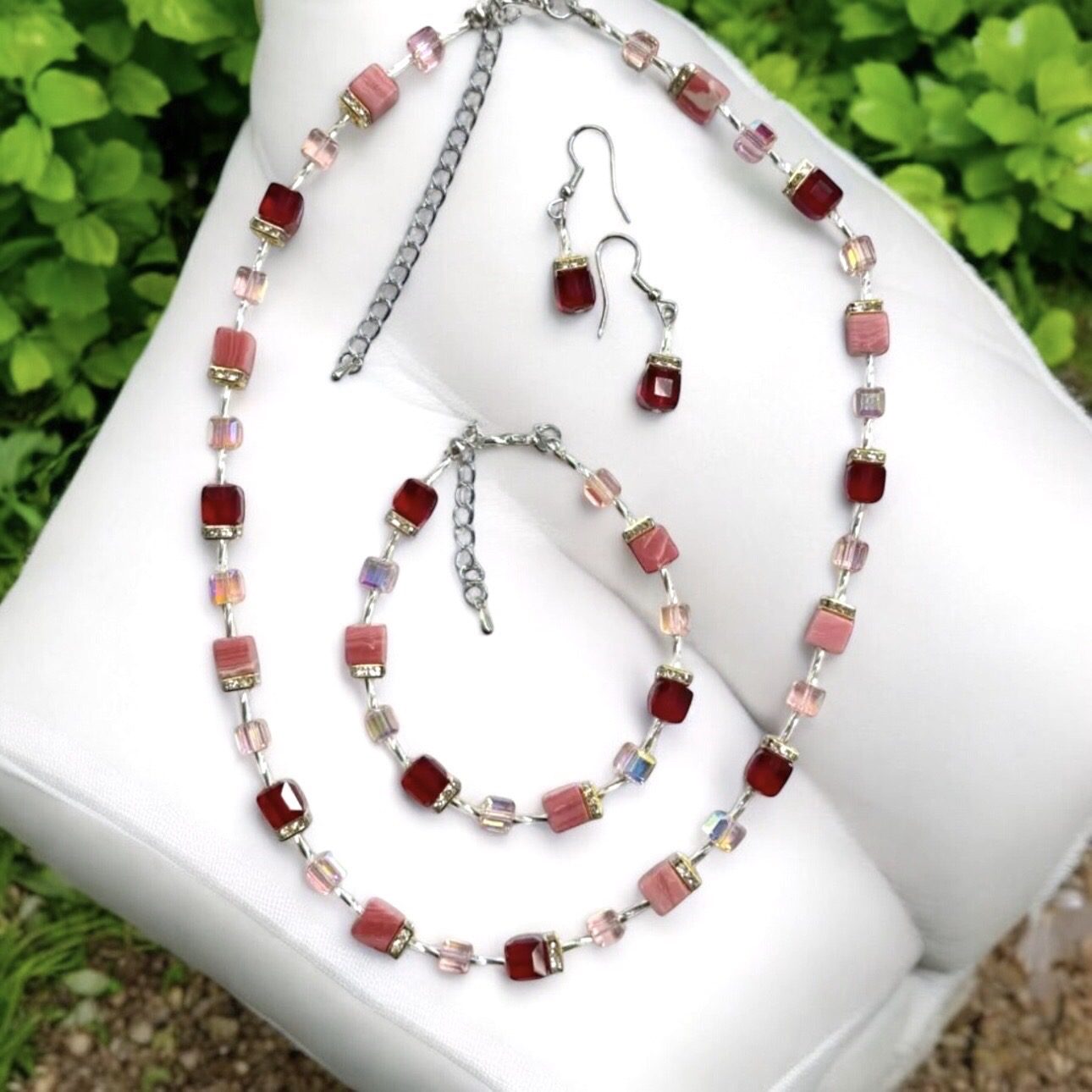Leila rózsaszín-piros színű nemesacél nyaklánc SZETT